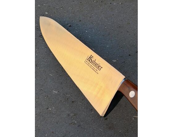 Ces articles de collection que nous vous proposons (stock limité) sont une garantie que notre entreprise est très ancienne avec une longue histoire. Ces couteaux ont été fabriqués par la Sixième Génération. Il s'agit d'un couteau de CUISINE 28 CM dite Canadienne (Petite Mitre). Il a été fabriqué dans les années 1970. Forgé à la main visible par la soie du couteau : - plus épaisse vers la mitre - très fine vers le bout du manche Emouture faite à la main (méthode traditionnelle). Pouvoir Coupant extraordinaire. Acier INOXYDABLE Vieille marque sur la lame (Sabatier K) PARFAIT ETAT