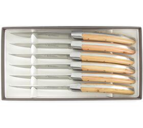 Maintenant, vous pouvez mettre un couteau Le Thiers ® à table. Le design sera différent selon le fabricant : Chambriard, Chazeau, Fontenille Pataud, Goyon Chazeau. La lame est en acier inoxydable, le manche peut être, quant à lui, en bois (Olivier, palissandre, ébène, amourette, bois de rose, genévrier, bouleau de Norvège...), en plexi ou manche de couleur, en acier brut, brossé.