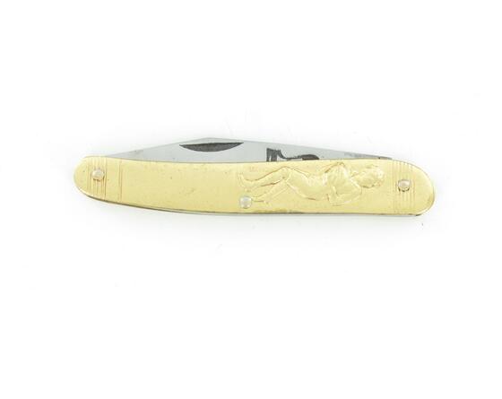 Couteau 2 pièces (2 lames) avec manche en Laiton représentant un chasseur sur une face, un chien à l'arrêt devant un gibier sur l'autre face.
